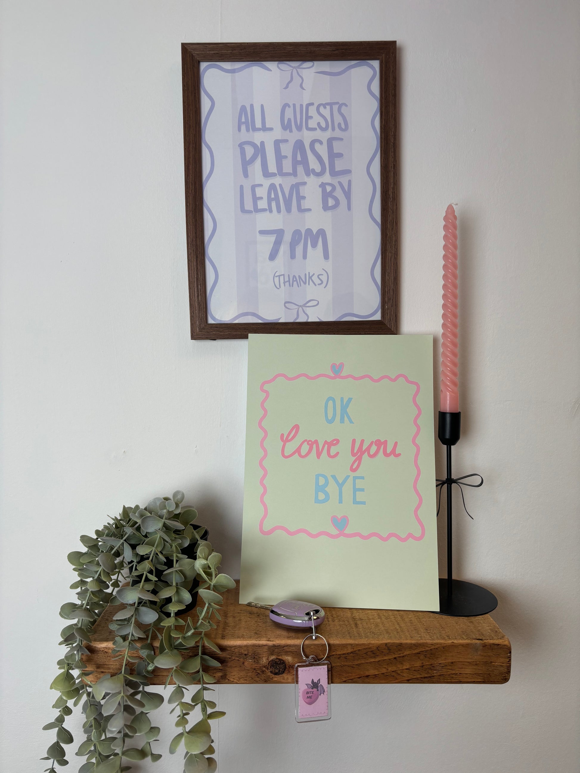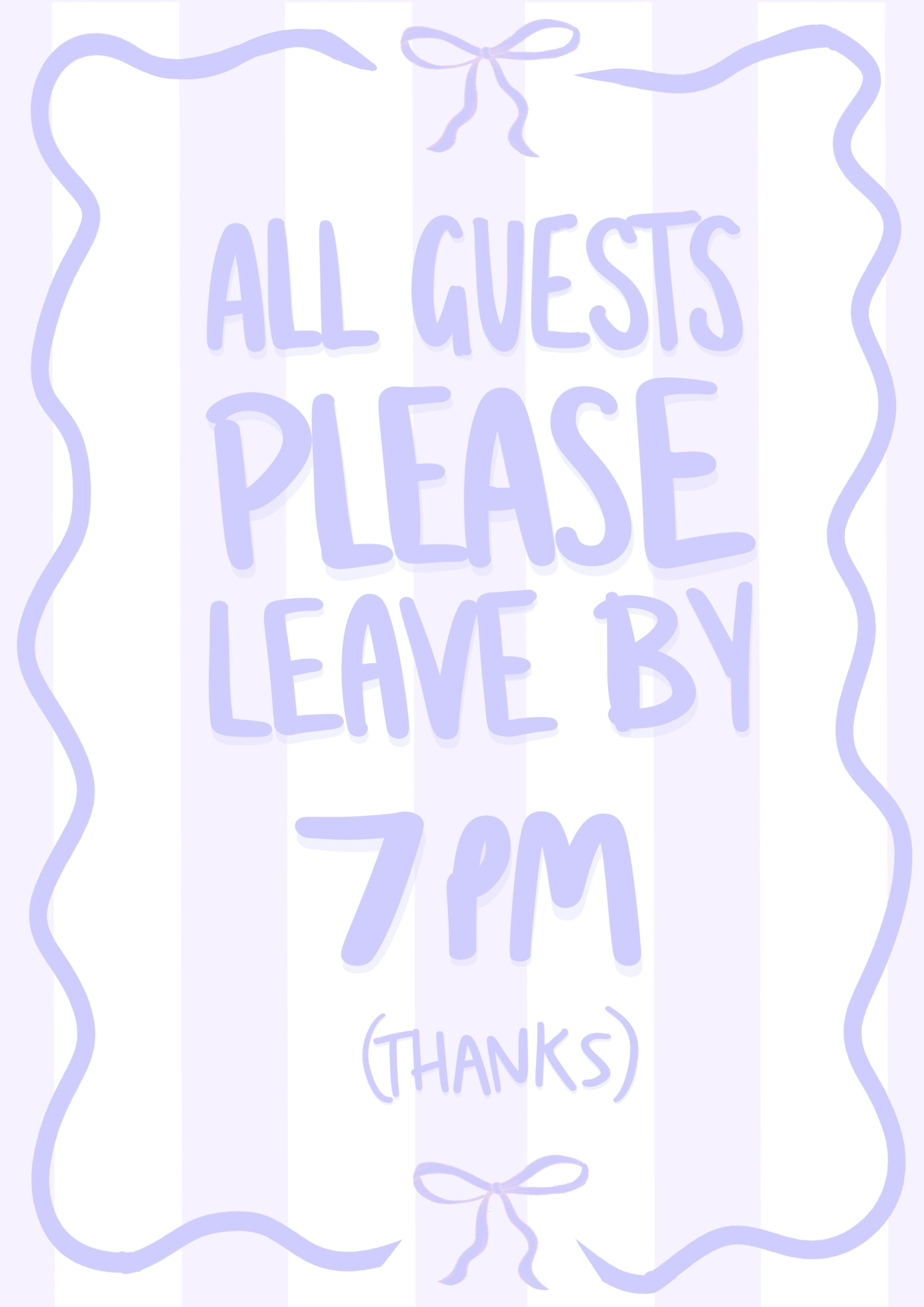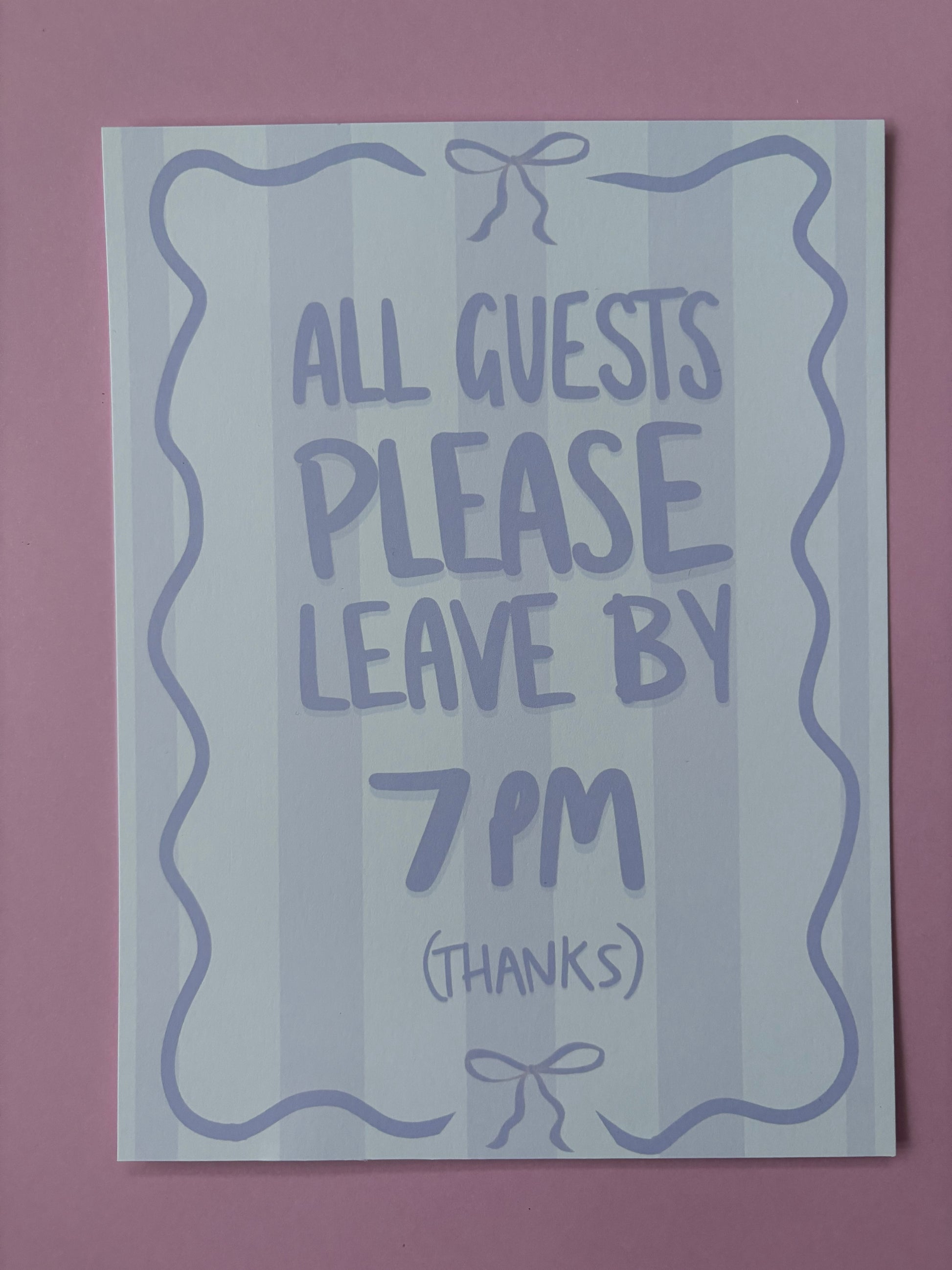 Illustrated Purple "All Guests Please Leave by 7pm Thanks” Print. Comes in sizes 5x7 inch, 8x12 inch and 12x16 inch in Matte Card