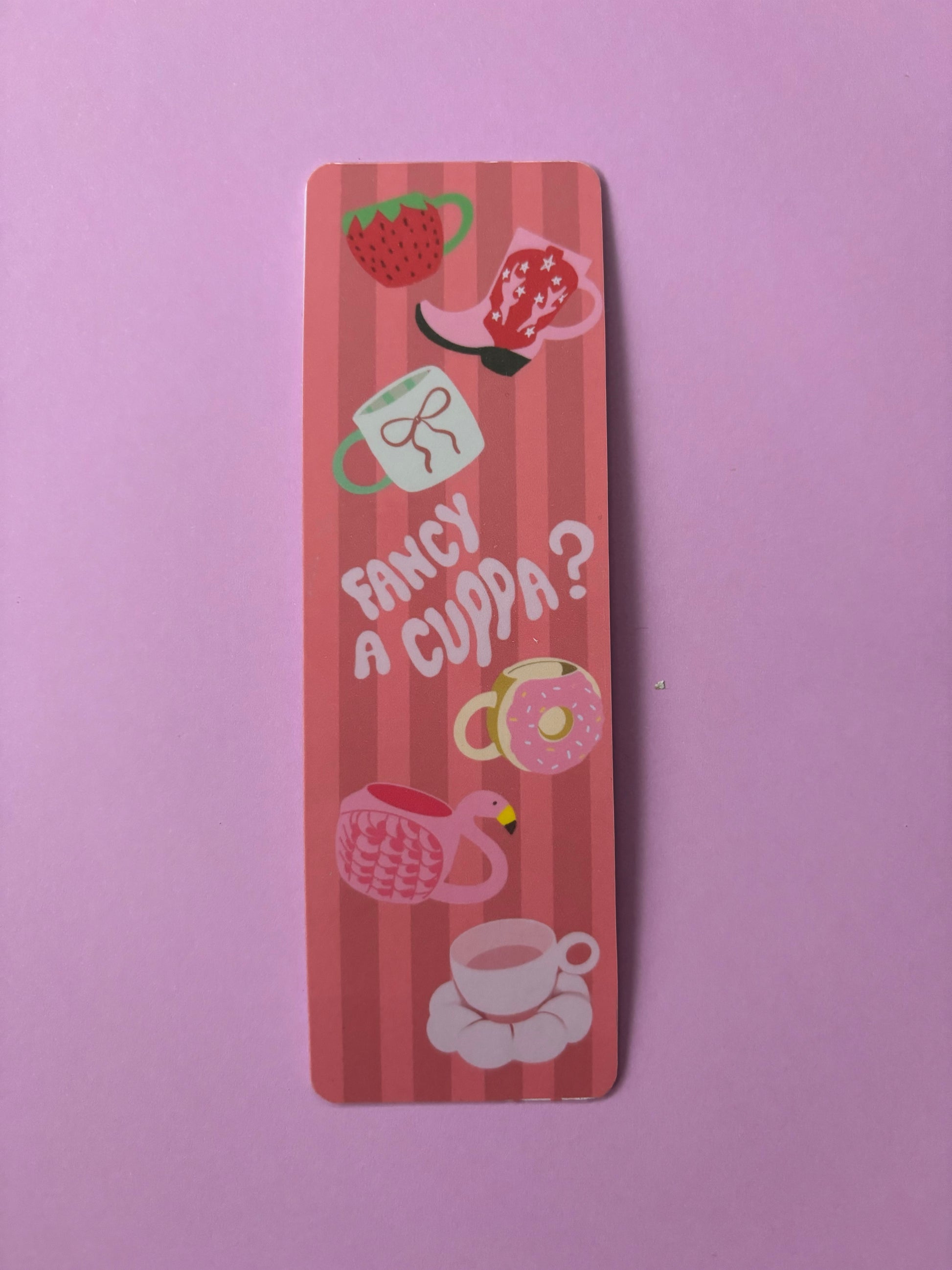 Illustrated Red Fancy a Cuppa Bookmark, Laminated with round corners.