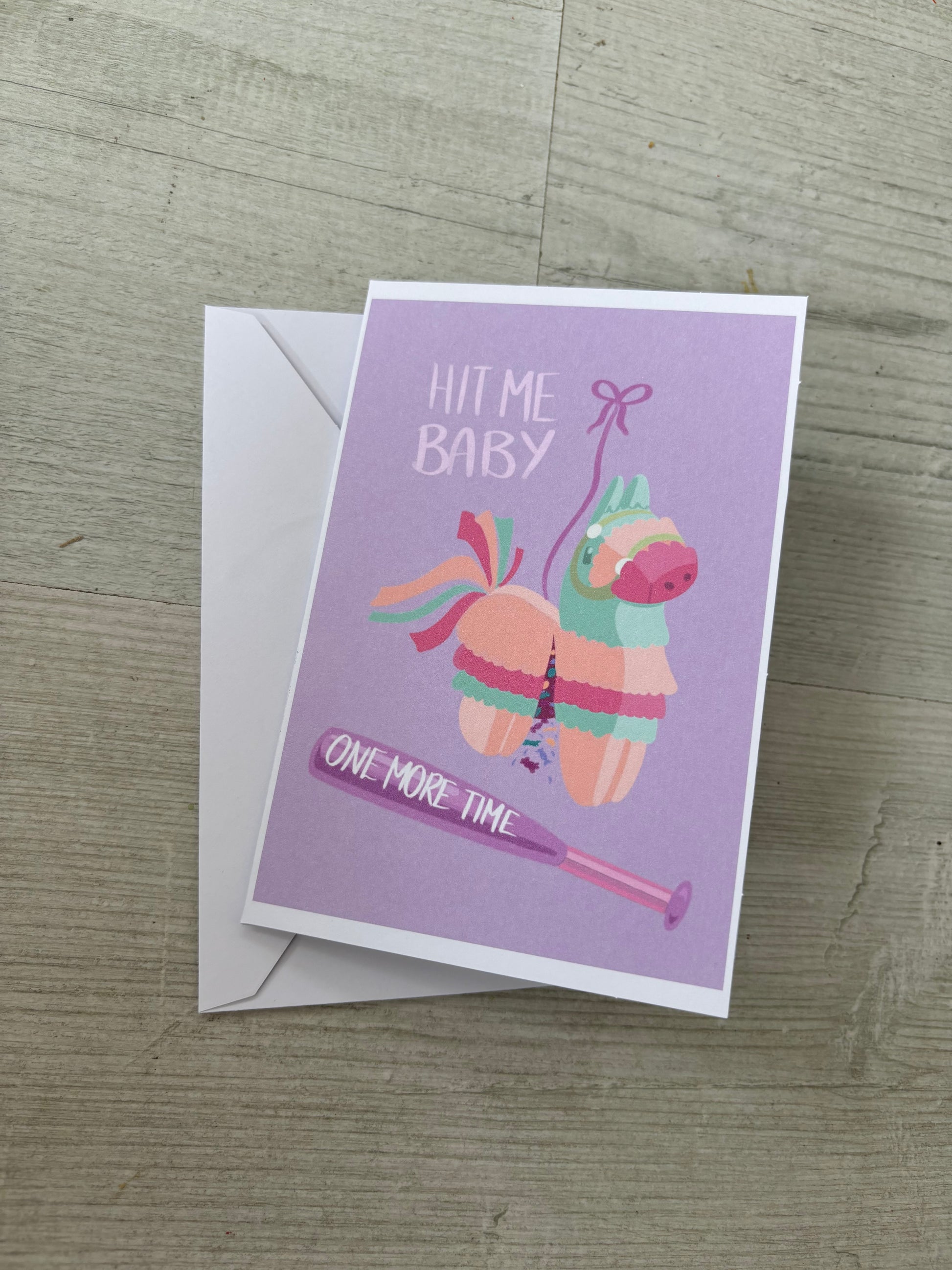 A fun punny Piñata “Hit Me Baby One More Time” Britney Spears Card. 5x8 inches unfolded. Printed on Matte Card. Envelope included.