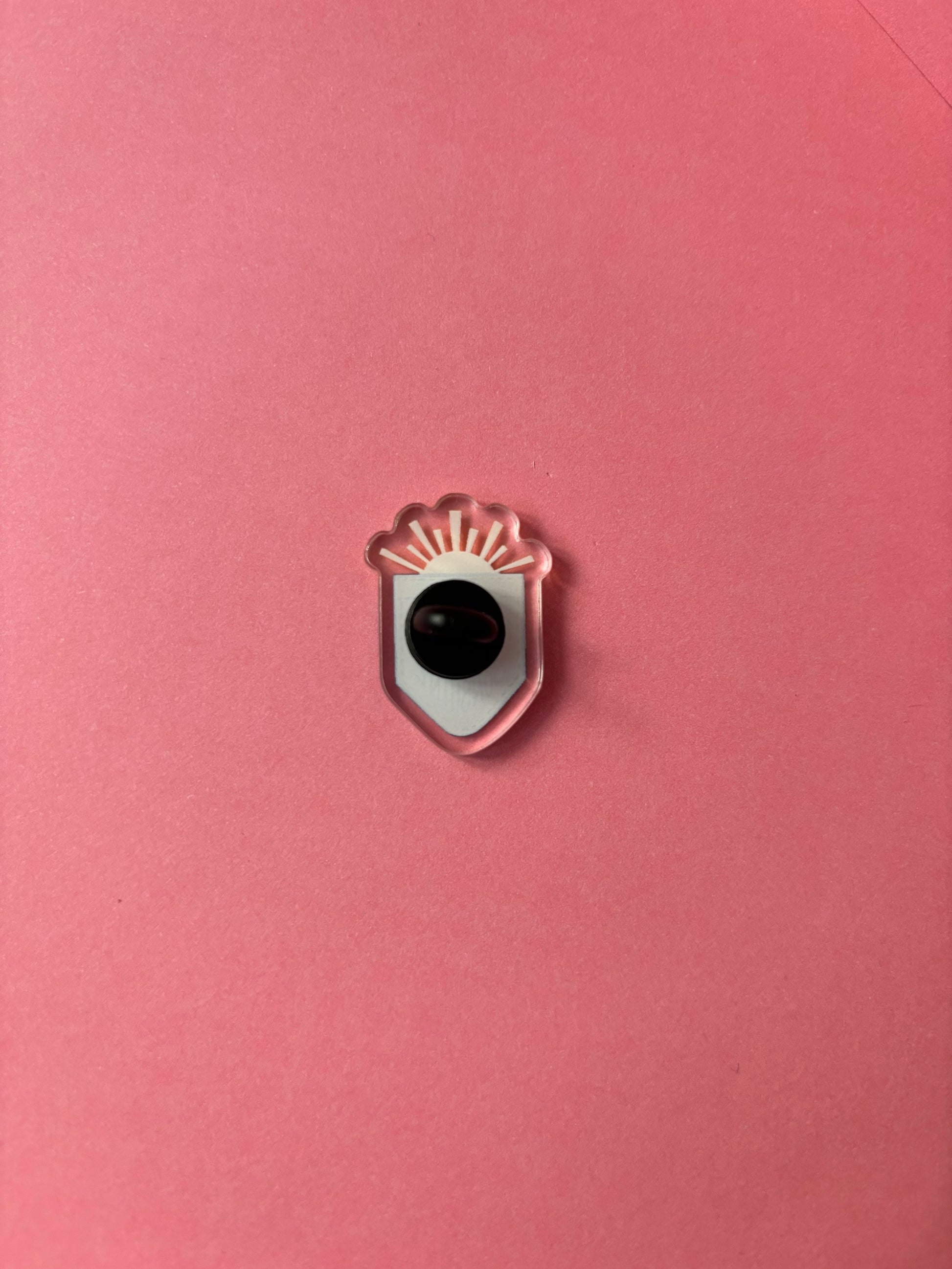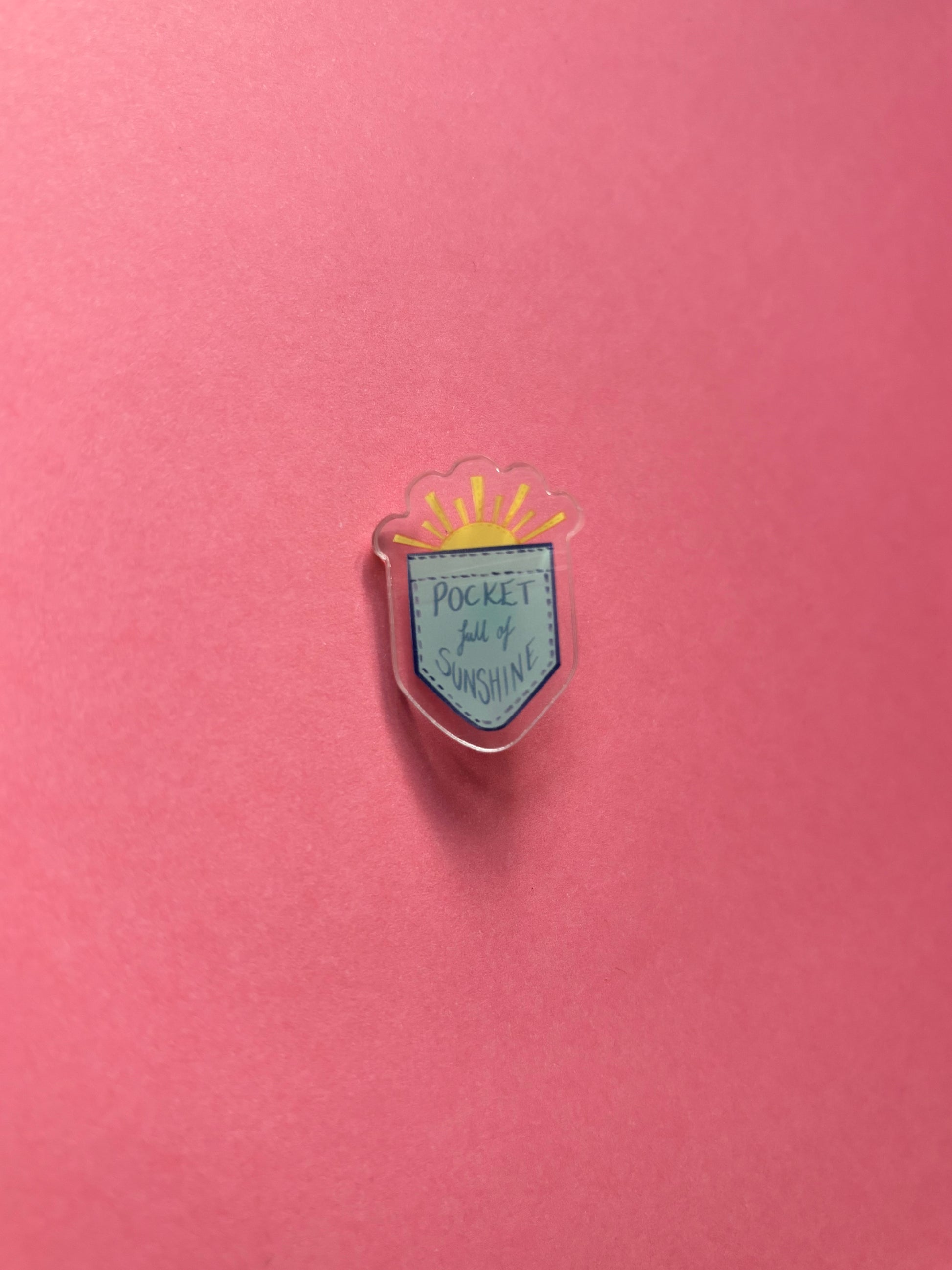 An Acrylic Pin Badge of the Design “Pocket Full of Sunshine”. Rubber Back included